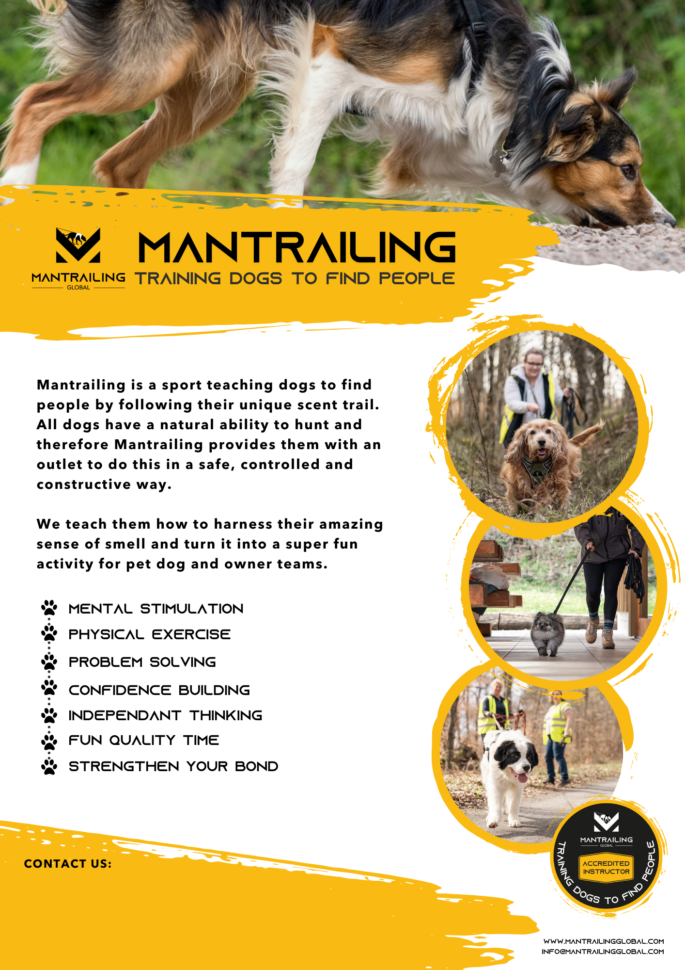 ManTrailing is rooted in Search and Rescue work, where dogs learn to locate a specific missing person using their incredible sense of smell. In our workshops, we teach you and your pet dog to do this safely, playfully, and just for fun.
